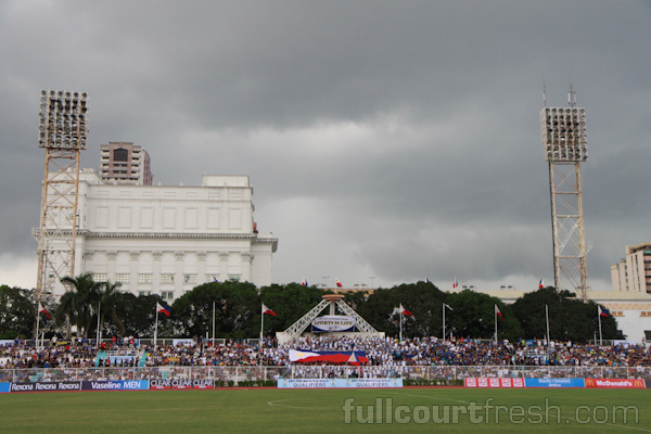 With the sky clearing up and the sun starting to brighten up the stadium, a large Philippine flag is paraded on spectators at the Rizal stadium.