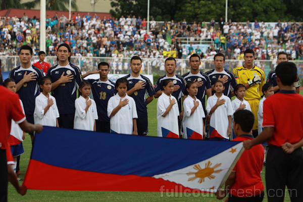 Chieffy Caligdong, a striker from the Philippine Air Force, salutes to the flag while the half-Filipino Azkals sing what they remember from their much-practiced “Lupang Hinirang.”