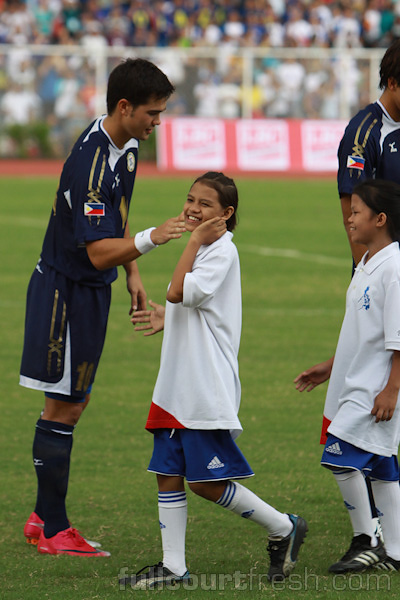 The Philippines’ First XI with some kids from Tuloy sa Don Bosco shelter (click for a bigger photo): (L-R) Phil Younghusband, James Younghusband, Paul Mulders, Angel Guirado, Chieffy Caligdong, Manny Ott, Stephan Schrock, Anton del Rosario, Rob Gier, Neil Etheridge, and Aly Borromeo